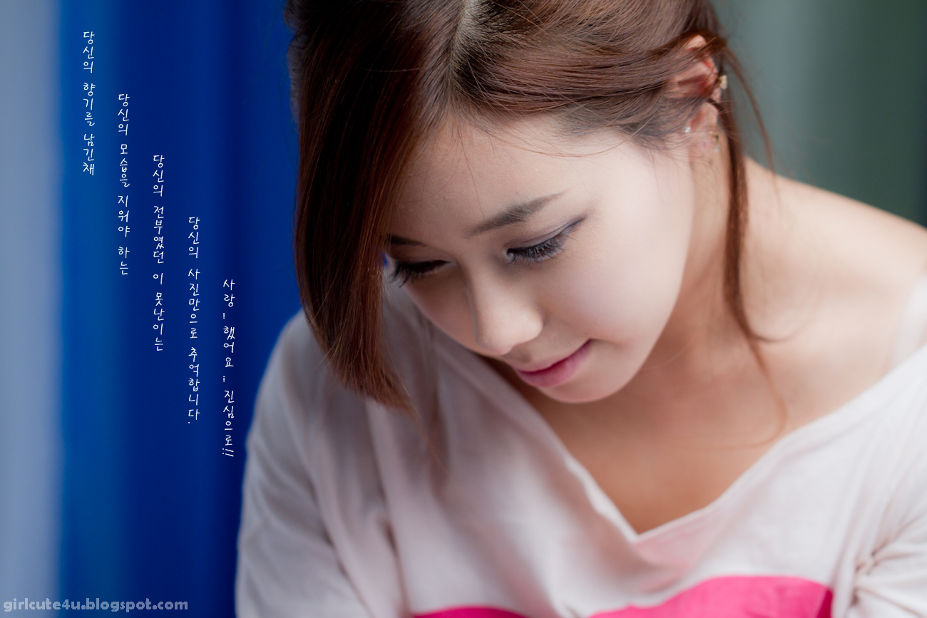 Kim Ha Yul looks super cute in a “love is…” pink heart t-shirt and pink shorts on a bed. Even with a loose fitting top KHY is able to tease quite a bit. She is really a very cute korean girl